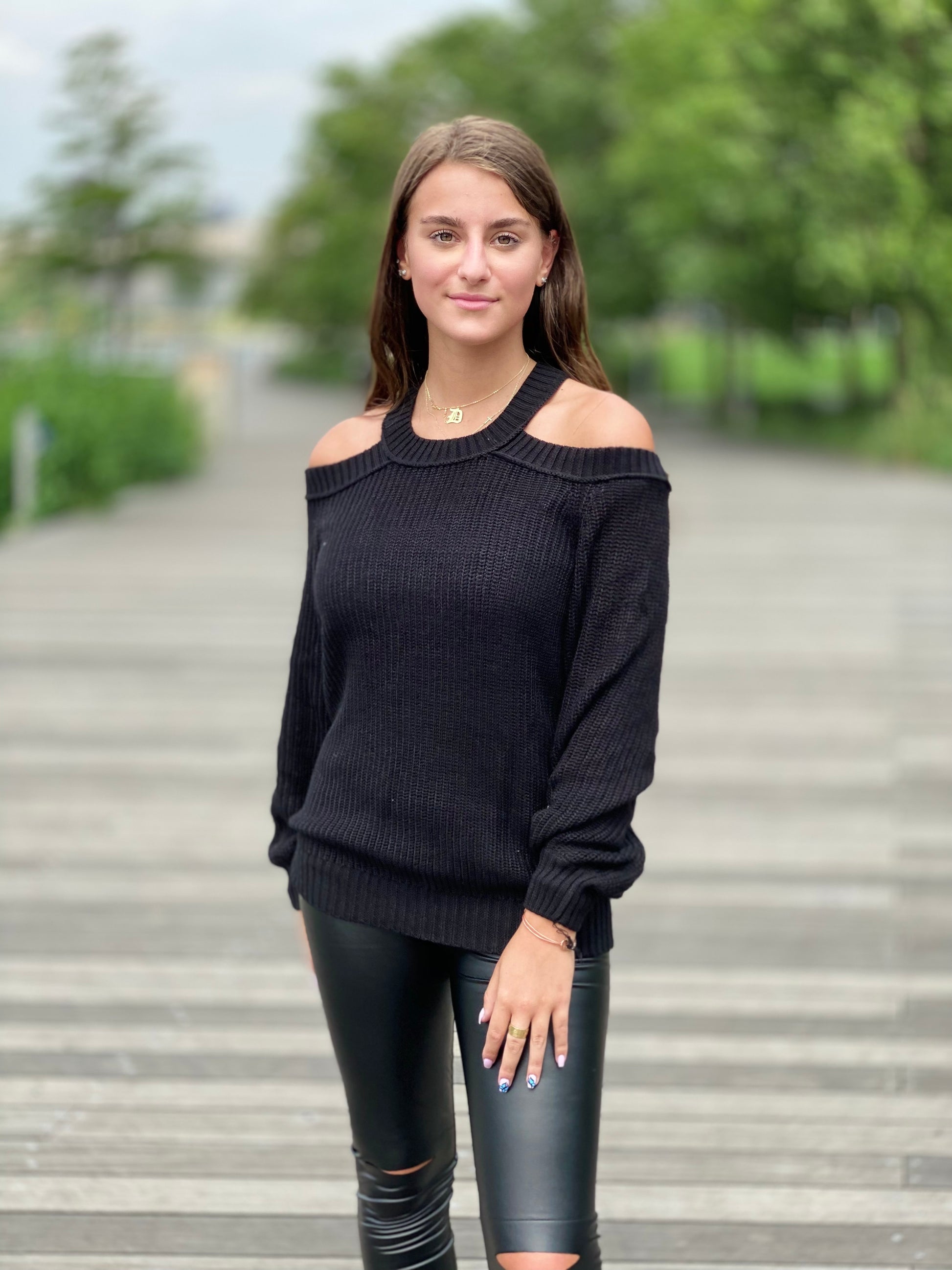 This sweater is super cute and the back is super trendy love the colors comes in blue and in black