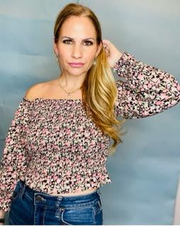 Womens floral elastic ruffle blouse. Can be worn on or off the shoulder.