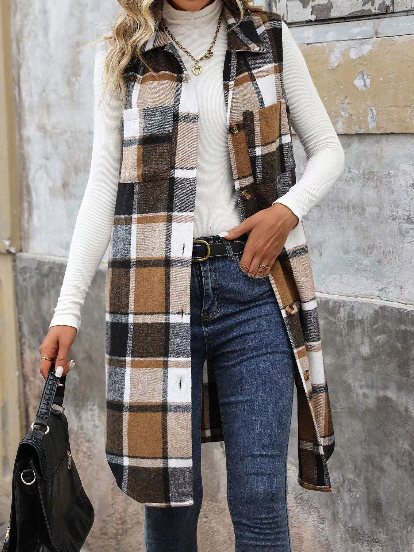 Add a touch of rustic charm to your outfit with the "Plaid Vest with Buttons." This sleeveless plaid vest features warm, earthy tones of brown, black, and cream, perfect for layering over your favorite tops. The button-down front adds functionality and style, while the soft, textured fabric keeps you cozy throughout the day. Designed with a flattering longline silhouette and practical front pockets, this vest is perfect for transitioning between seasons. Pair it with jeans and boots for a casual, chic look or layer it over a sweater for extra warmth during cooler months. Ideal for both casual outings and cozy indoor settings!